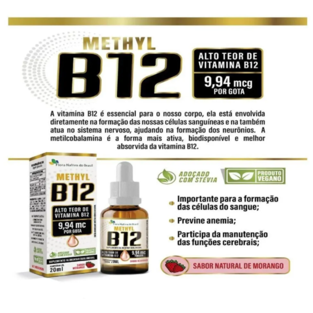 A Vitamina B12 Sublingual Flora Nativa é formulada com Metilcobalamina, a forma mais biodisponível e ativa da vitamina B12, garantindo melhor absorção e eficácia. Cada gota fornece 9,94 mcg de vitamina B12 pura, ideal para suprir as necessidades diárias de energia, foco mental e saúde neurológica.