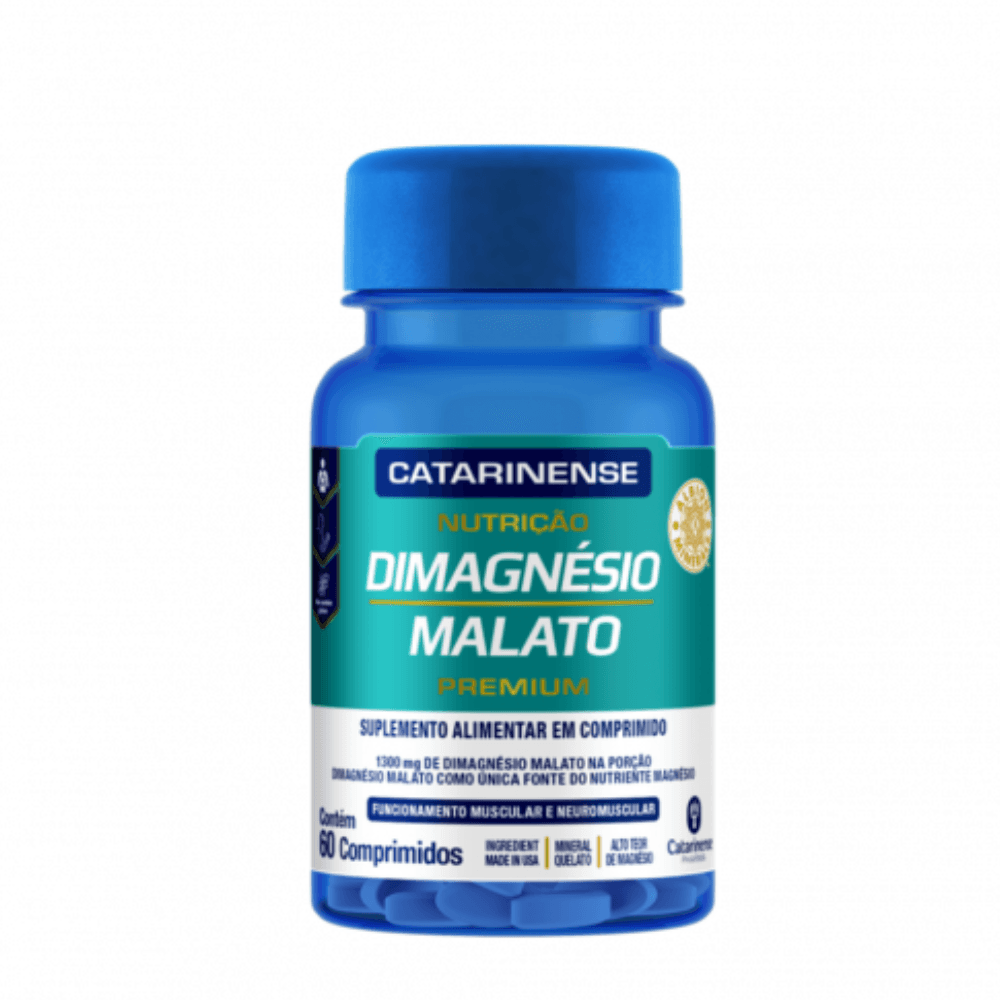 Dimagnésio Malato Premium com 60 Comprimidos - Catarinense é um suplemento alimentar que fornece magnésio de alta biodisponibilidade, essencial para diversas funções fisiológicas no organismo.