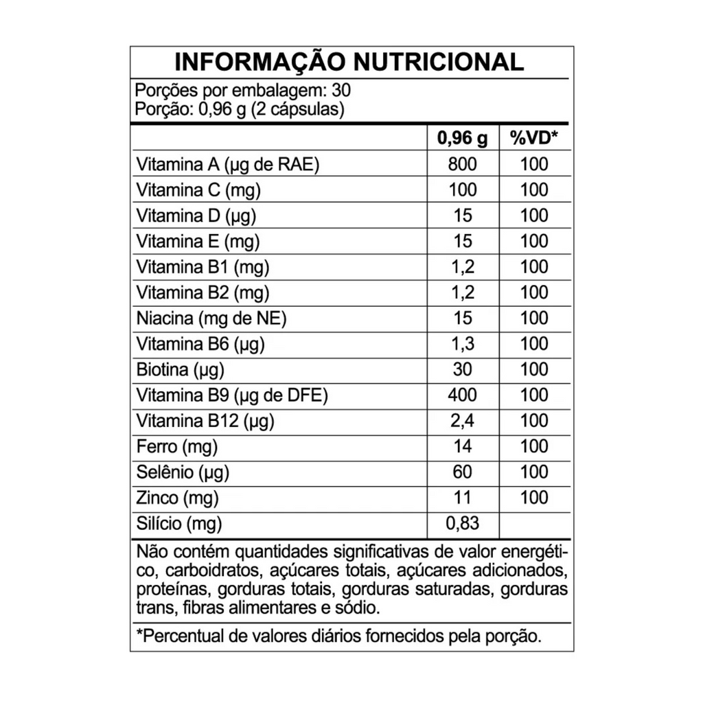 Vitaminas A, C, D, E, complexo B (B1, B2, B3, B6, B12, Ácido Fólico, Biotina), Ferro, Zinco, Selênio e Silício.