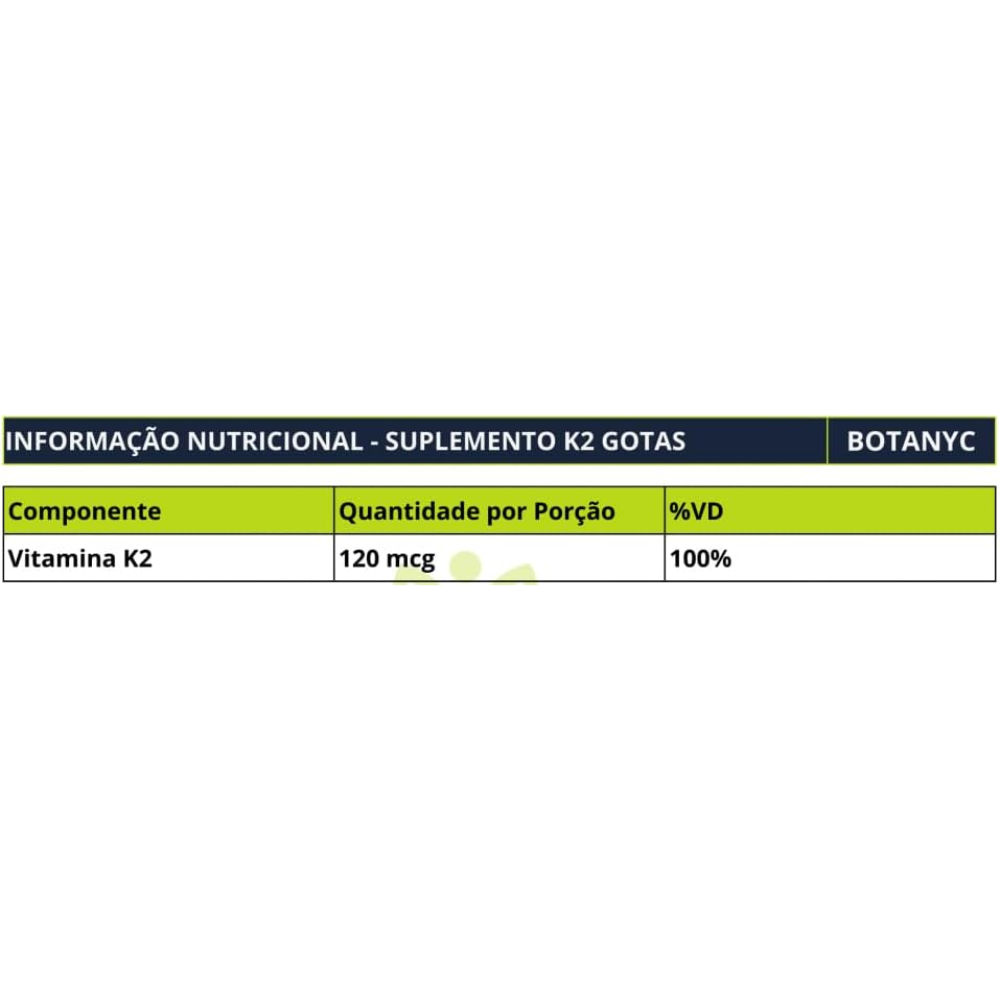 Cada gota fornece 120 mcg de vitamina K2 pura, essencial para a fixação adequada do cálcio nos ossos e dentes, além de prevenir o acúmulo de cálcio nas artérias, promovendo coração e vasos sanguíneos saudáveis.